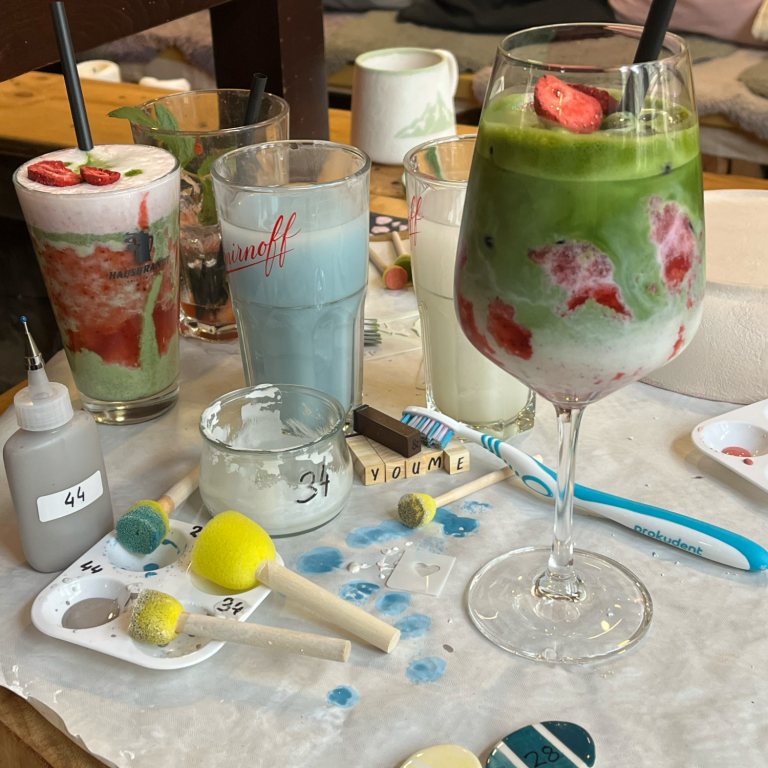 In Deinem Ticket sind eine Keramik im Wert von bis zu 35 €, Sonntags als Cake & Paint Special ein Stück hausgemachten Kuchen, sowie zwei Getränke Deiner Wahl enthalten – von cremigem Matcha über aromatischen Hojicha bis zu unseren Signature-Cocktails oder Mocktails oder erfrischenden Softdrinks. Hast Du eine Allergie oder unverträglichkeit? Schreibe alles bei Deiner Buchung dazu, dass wir es beachte können.